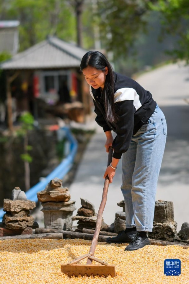 陈晓丽帮村民翻晒玉米(4月18日摄)。新华社记者 张铖 摄