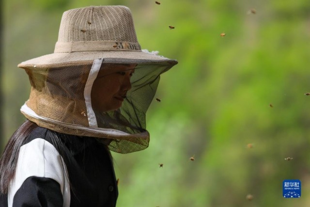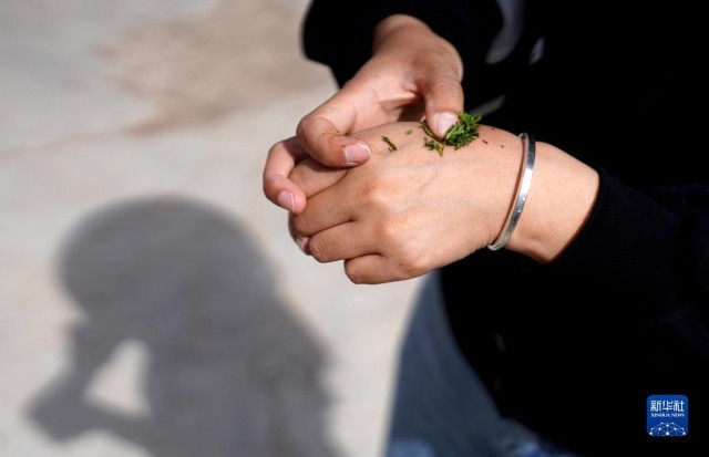 陈晓丽用草药处理被蜜蜂蜇的伤处(4月18日摄)。新华社记者 李安 摄