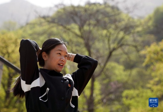 陈晓丽在帮村民胡金英干活前扎起头发(4月18日摄)。新华社记者 李安 摄
