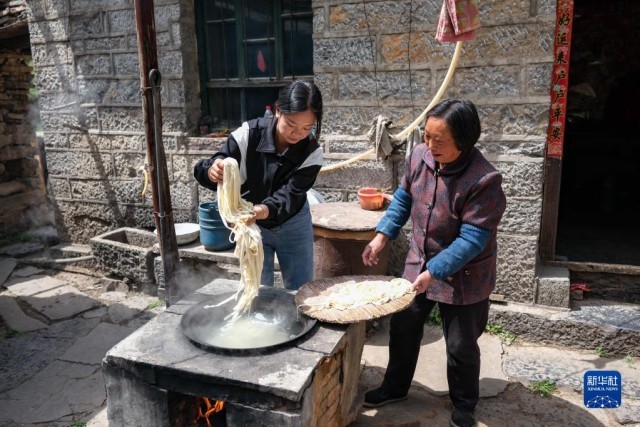 陈晓丽(左)在 “老赵农家乐”帮助村民桑风英煮手擀面(4月18日摄)。“老赵农家乐”是村民赵长根、桑风英两口子用自家房子开的,主要做农家饭。新华社记者 张铖 摄