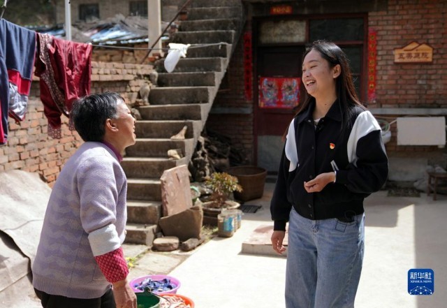 陈晓丽(左)和村民桑启英聊天(4月18日摄)。新华社记者 李安 摄