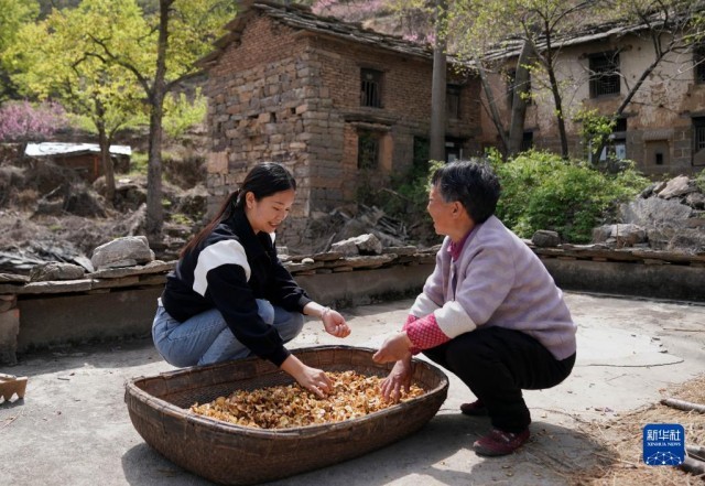 陈晓丽(左)帮村民胡金英晾晒苹果干(4月18日摄)。新华社记者 李安 摄