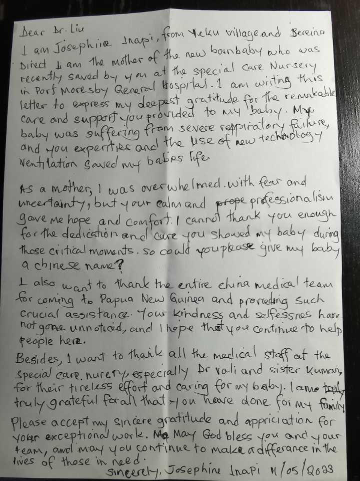 4月,援巴布亚新几内亚中国医疗队运用新生儿呼吸机辅助通气技术,成功挽救了约瑟芬孩子的生命。在信中,她真诚请求医疗队副队长、重庆医科大学附属儿童医院新生儿科副主任医师刘振球给孩子取一个中国名字,以永久铭记这份恩情。