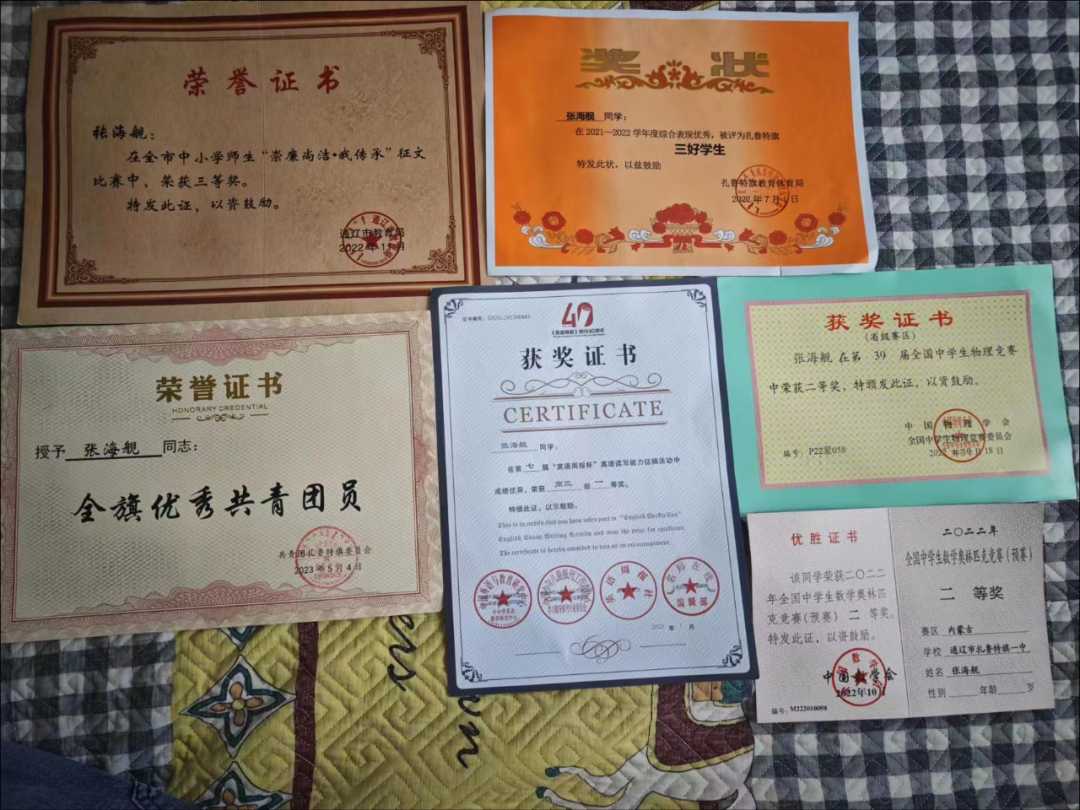 2022年全国高中数学联赛(内蒙古赛区)二等奖、2022年全国第39届物理奥赛(内蒙古赛区)二等奖、《英语周报》创刊四十周年“英语周报杯”读写能力征稿活动一等奖、扎鲁特旗“三好学生”、2023年通辽市“新时代好少年”、“通辽市优秀共青团员”……在张海舰的家里,满满的一墙奖状,成为家里最耀眼的装饰,这些都是他为梦想铺设的一个个“阶梯”。