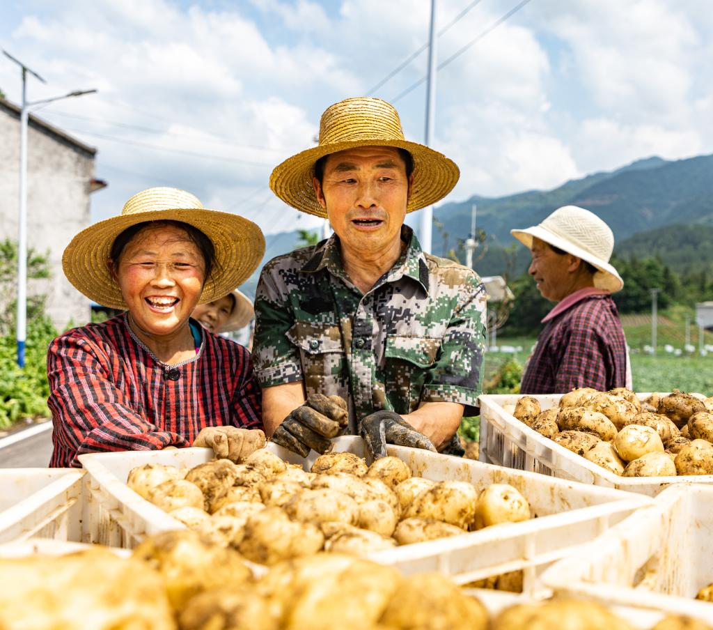 5月29日,在重庆市巫溪县尖山镇马铃薯综合试验示范基地,村民在展示刚挖出来的马铃薯。新华社发(冉梦竹 摄)
