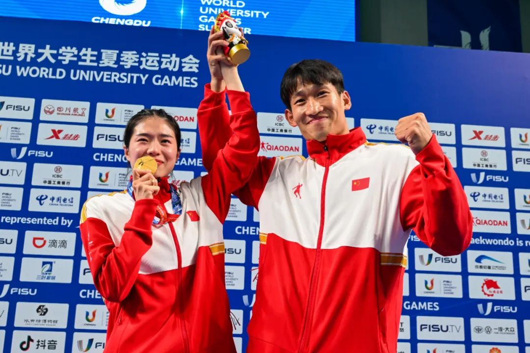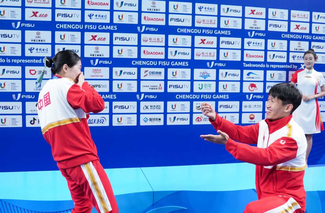 7月30日,胡明达(右)在颁奖台旁向梁婕求婚。新华社记者 江宏景 摄