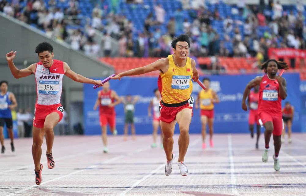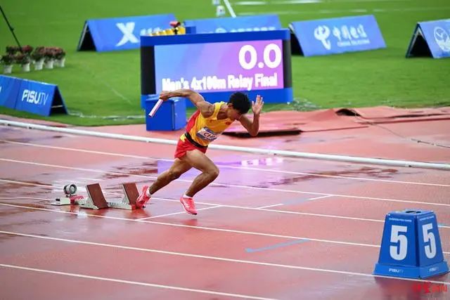 中国队第一棒陈佳鹏起跑瞬间。(图片来源:红星新闻)