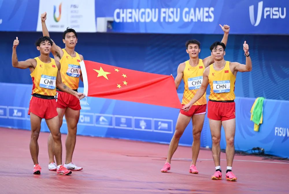 8月6日,中国队选手陈佳鹏、邓智舰、严海滨、陈冠锋(从左至右)在比赛后庆祝。新华社记者王曦 摄