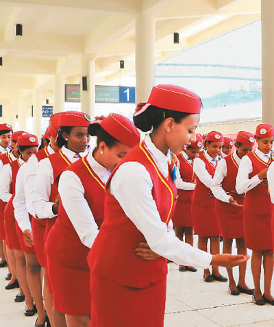 项目建设和运营期间,亚吉铁路为埃塞俄比亚和吉布提两国提供就业岗位5.5万个。图为亚吉铁路列车乘务员培训现场。受访者供图