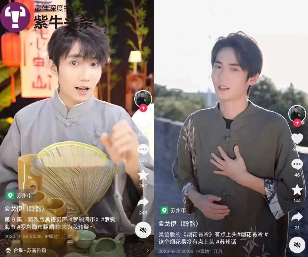 除了直播,戈伊还拍摄了不少短视频宣传苏州评弹,视频里,他身着新中式戏服,在极具苏州特色的小桥流水、亭台楼阁旁悠悠地唱着《半沙壶》《女儿情》《鸳鸯戏》,吴侬软语惊艳了网友,温柔了时光,“想用这些有趣又新鲜的形式把我们苏州评弹带到更多人的视野里,让更多人喜欢。”