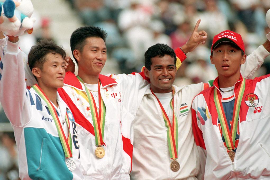 1994年10月13日,在第12届亚运会网球男子单打决赛中,中国运动员潘兵(左二)夺得金牌。新华社记者鞠鹏摄