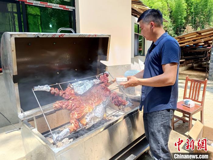 京易山羊养殖专业合作社正在烤制的烤全羊。袁静 摄
