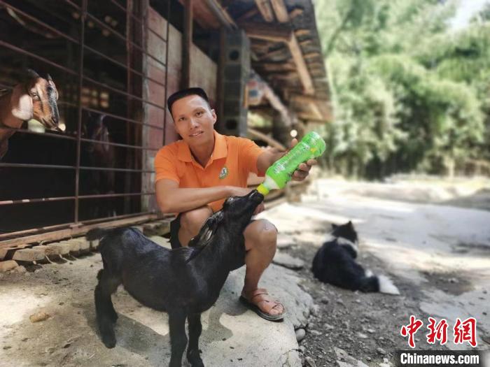 湖南桃江县京华村“牧羊人”易文言正在喂养小羊羔。 受访者供图