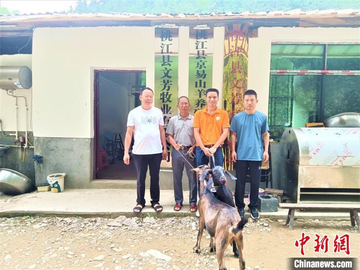 京华村低保户邓南胜(左二)在易文言(右二)的山羊养殖专业合作社领取种羊。 受访者供图