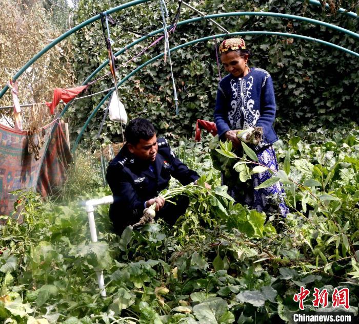 天气渐冷,10日,村警阿力木·尼扎木敦帮助孤寡老人海尼萨.马力克干农活。陶拴科 摄
