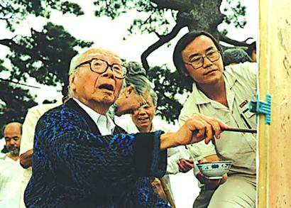 刘蟾说,是黄山多变的流云,给了刘海粟丰富的灵感,他绘画胆子大,泼彩泼墨这样的创举是自然伟力在他心中的激荡呈现。纪录片《刘海粟》从上海科教电影制片厂片库中,找到了当年刘海粟作画泼墨的珍贵画面。在这一段堪称秘籍的电影片段中,刘海粟根本不用笔,他拿着小脸盆,盛满墨汁,对着宣纸直接泼了上去,一边泼,一边移动身体,进行着即时的艺术构思。