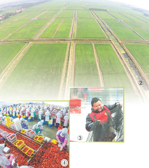 田成方、渠相连,旱能灌、涝能排,原本逢雨必涝的低湖田被改造成为虾稻共作基地,再交由农户承包经营。2014年,柴社会承包了60亩水田,生产的稻米和小龙虾由华山公司保底收购,直接运往华山小龙虾产业科技园加工。华山公司还帮他购买了商业养殖保险,一旦受灾每亩最高可赔付800元。2015年,他又承包了35亩,年收入超过20万元。