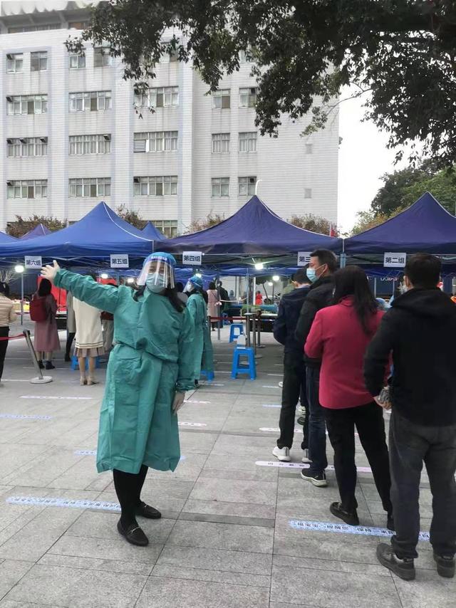 这个年轻人叫陈洁璇,她的故事在抗疫人员的小圈子里已经传开了。1月13日,记者在福保街道长长的测核酸队伍旁边看到了一个穿防护服的身影,那就是连续几天在现场维持秩序的陈洁璇。