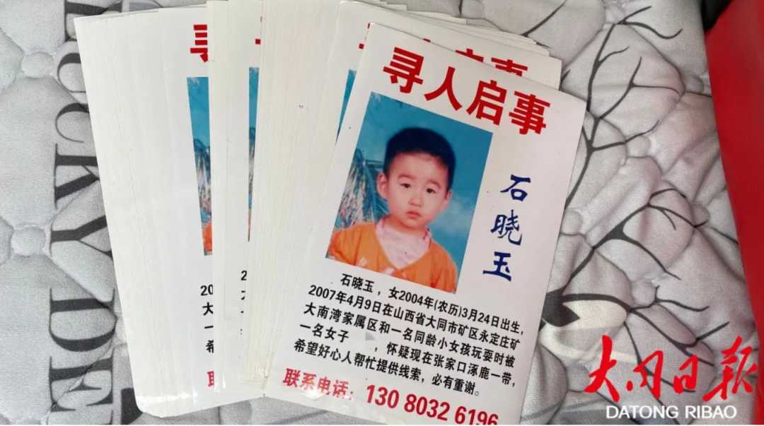 石日成的女儿石晓玉,出生于2004年农历三月廿四,在她3岁生日的前一个月,即2007年4月9日17时30分许,在云冈区永定庄矿大南湾家属区,与一名小女孩玩耍时丢失。丢失时,石晓玉身穿粉色毛衣、黑蓝色棉裤、粉色旅游鞋,衣着最明显的标记是棉裤的右侧还缝有“A、B、C”3个手工字母。