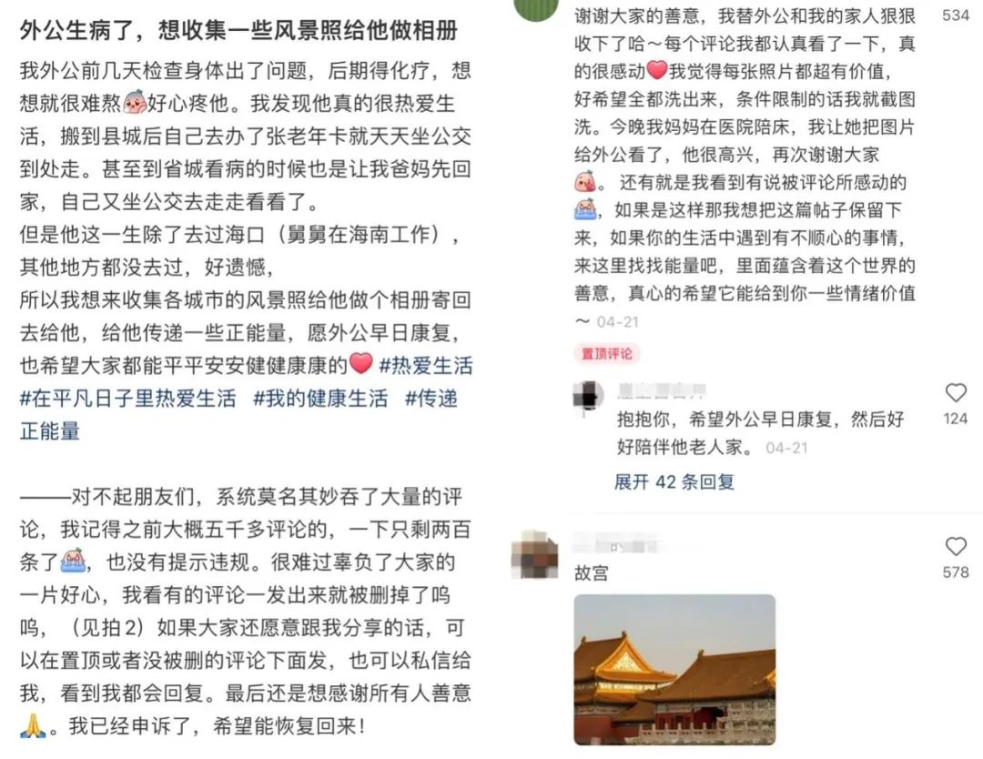 近日,某社交平台上一篇名为“外公生病了,想收集一些风景照给他做相册”的求助帖,收到了大量点赞和带图评论。
