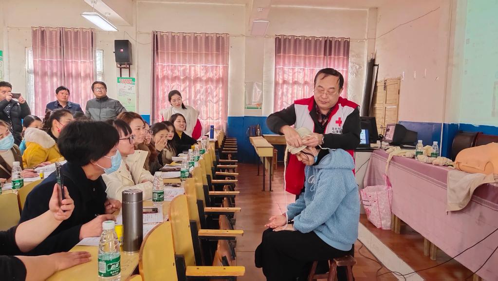 图为夏云剑(右)作为红十字应急救护培训师在授课。(受访者供图)