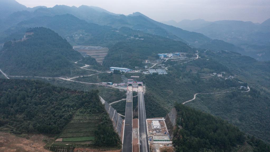这是2022年10月13日拍摄的兰州至海口国家高速公路重庆至遵义段(贵州境)扩容工程项目桐梓隧道。当日,桐梓隧道右幅顺利贯通。新华社记者 陶亮 摄