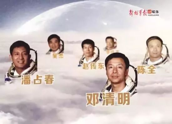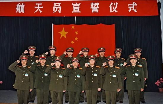 中国航天员大队首批14名航天员(前排左起邓清明、聂海胜、杨利伟、吴杰、费俊龙、赵传东、翟志刚,后排左起刘旺、景海鹏、刘伯明、李庆龙、陈全、张晓光、潘占春)