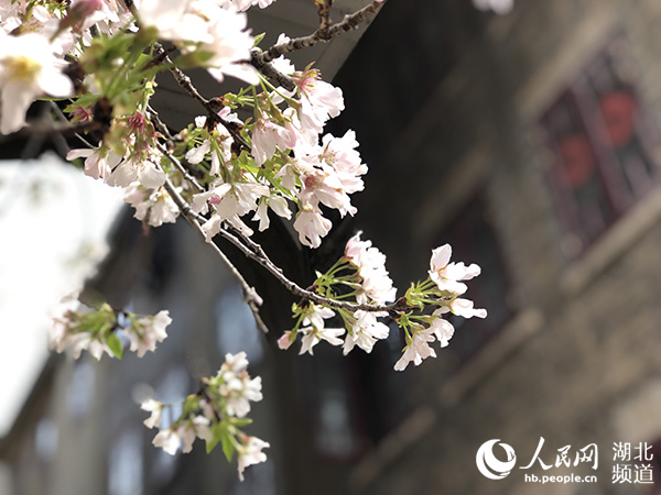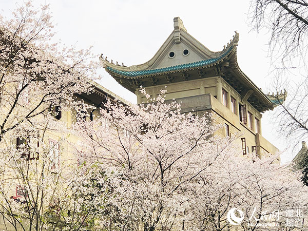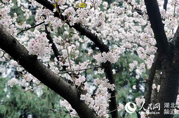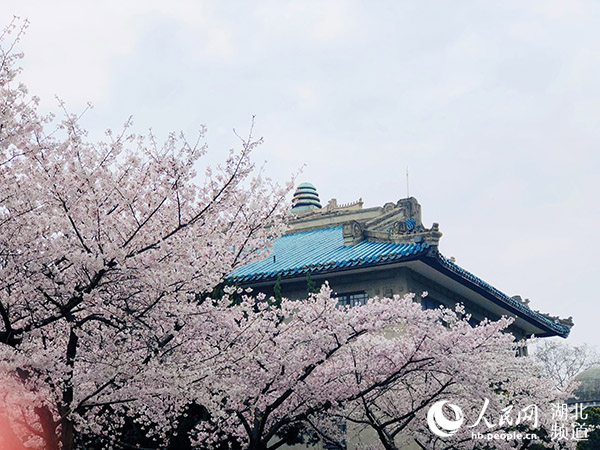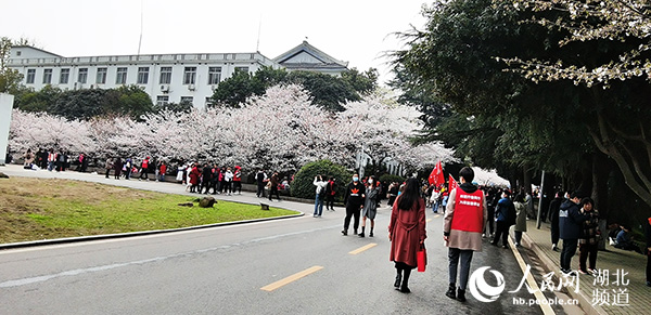 武汉大学樱花盛开静待游人。人民网周恬摄