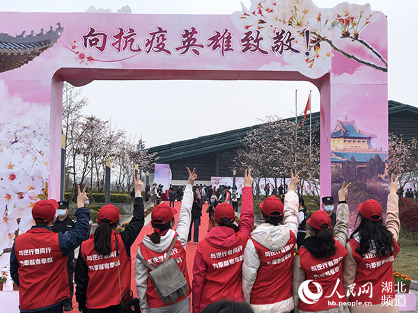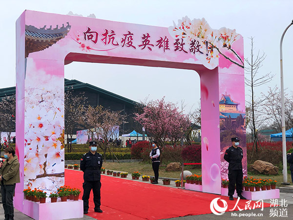 向抗疫英雄致敬!武汉大学设置了红地毯和拱门,欢迎援鄂医护人员前来赏樱。人民网周恬摄
