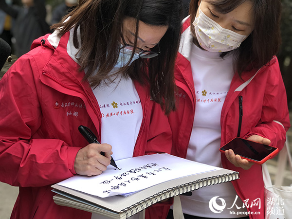曾经支援武汉雷神山的医疗队队员写下寄语:全心全意为人民服务,把患者放在第一位。人民网周恬摄