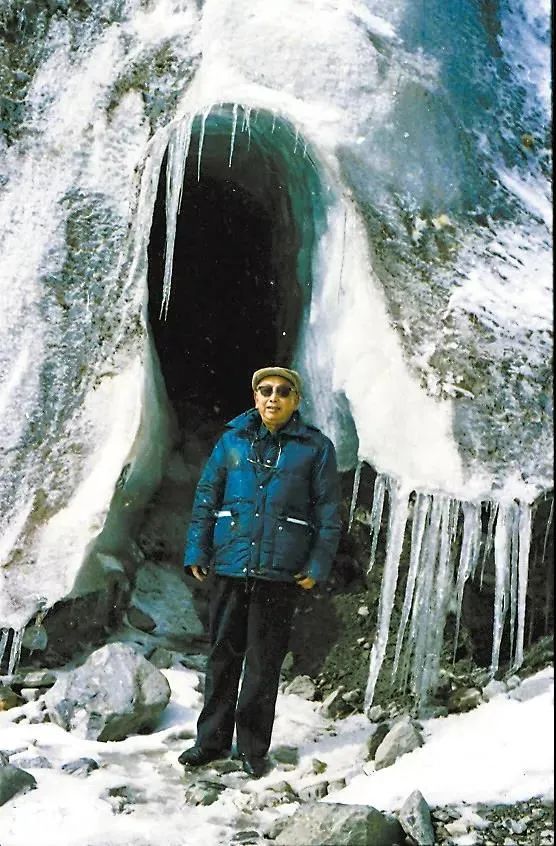 1985年,施雅风在天山1号冰川科考时在冰洞前留影。图片来源:中科院兰州分院