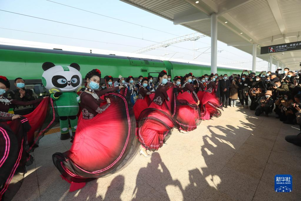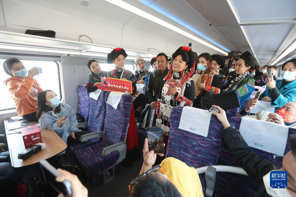 1月10日,在D843次复兴号动车组列车上,德昌县傈僳族群众身着盛装表演节目。新华社记者 江宏景 摄