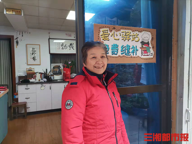 高燕今年60岁了,年轻时在九龙服装厂担任缝纫工,后来辗转去了长沙毛毯厂。1990年高燕退休下岗后,放不下对缝纫的喜爱,经常手工缝制一些衣物售卖,“那会服装厂不多,自己做的衣服很好卖,我赚了些本金后,自己开了一家洗衣店。”从那个时候开始,高燕就为来店里洗衣的客人免费缝补衣服。后来,高燕搬到了现在居住的小区。
