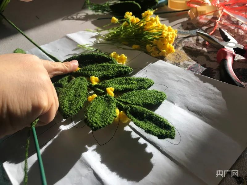 一次,张婧发现媛媛两天只做了几十个小黄花,以为是进度慢,但其实,媛媛默默在家做了几百个,剩下的她觉得不合适都没有上报。当记者问媛媛“多做的件数要付出多少辛苦”时,她没有回答,只是一笑,又将铜丝穿入黄色桂花的中心,一并拿起绿色毛线缠绕起来,而穿针的大拇指早已开裂,积起了一层坚硬的茧壳。
