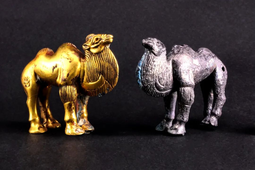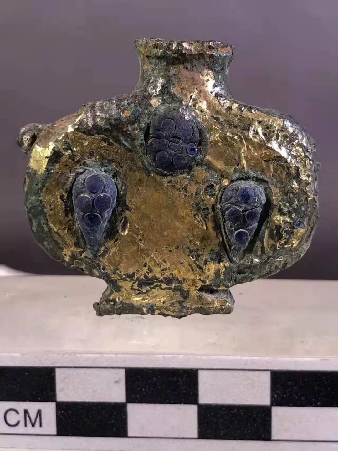 镶嵌琉璃的铜扁壶、玉鼎、银猎犬等