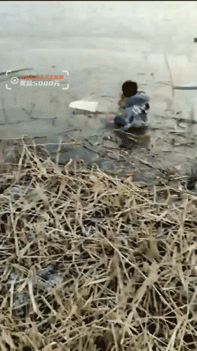 孩童在冰面上玩耍,不慎坠入冰窟窿。天寒地冻,情况十分危急。就在这时,一位少年挺身而出——