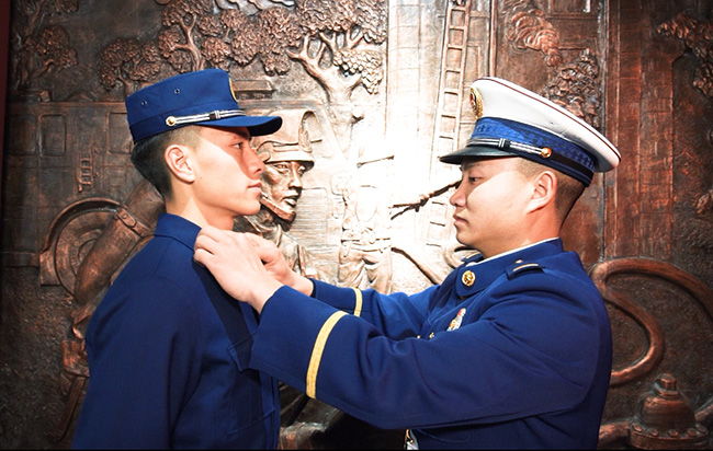哥哥为弟弟整理作训服衣领。 山东消防供图