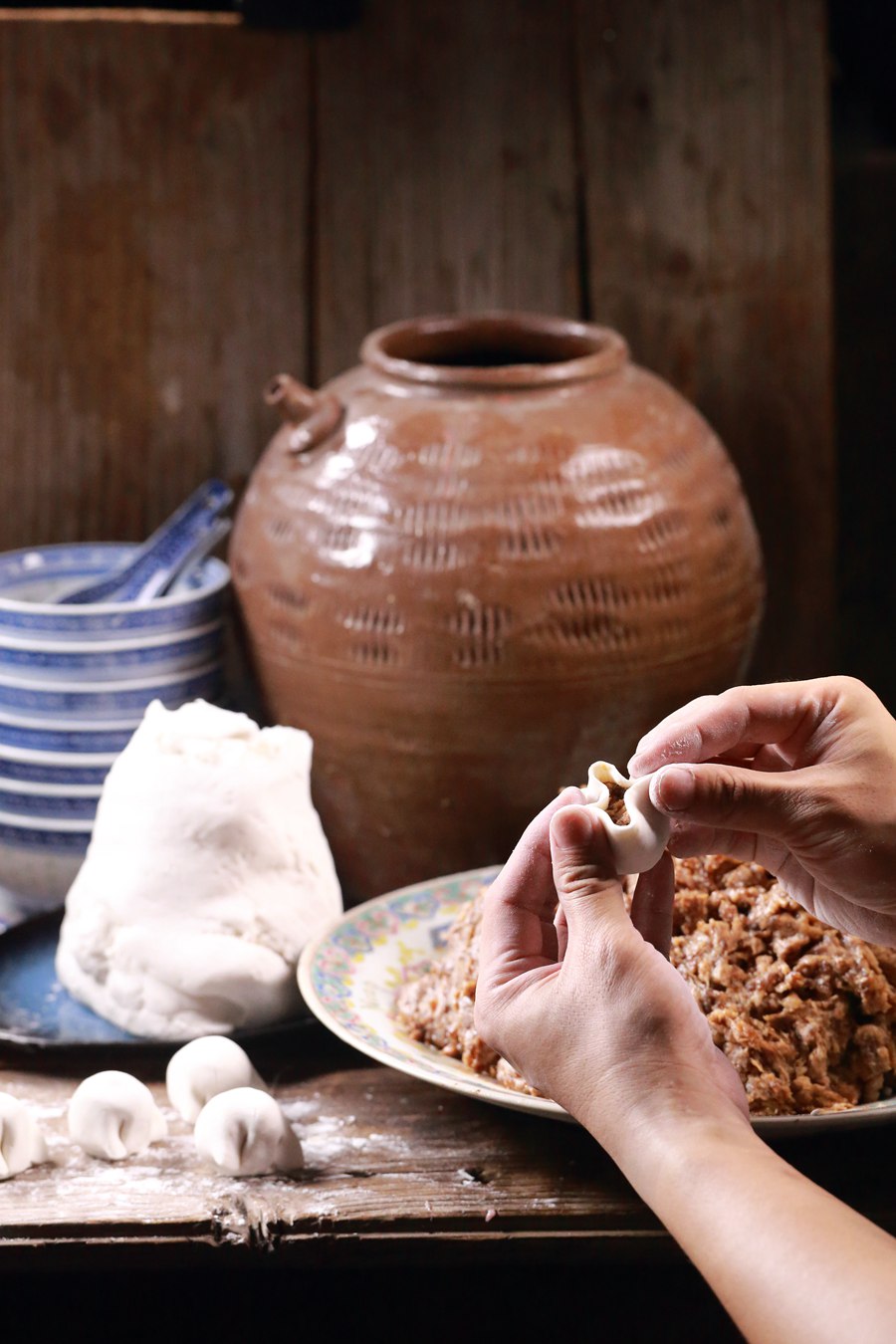 用小筷子夹上肉馅填入袋中,袋口对压在一折,形似小木鱼。林威摄