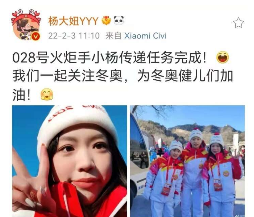 “028号火炬手小杨传递任务完成。”冬奥前夕,2020东京奥运会射击冠军杨倩完成火炬接力后,在微博上对参加冬奥会的运动员表达了祝福,“一起关注冬奥,为冬奥健儿们加油”。