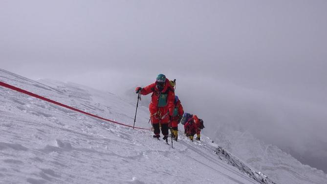 一次次的失败并没有使夏伯渝气馁。2018年5月14日,经过7天跋涉,69岁的他终于站上世界最高峰。
