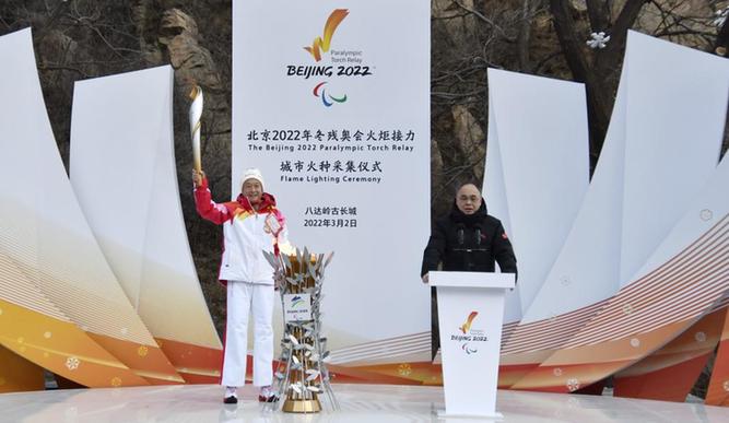 3月2日,夏伯渝(左)在北京冬残奥会火种采集仪式上展示点燃的城市火种火炬。新华社记者 李欣 摄