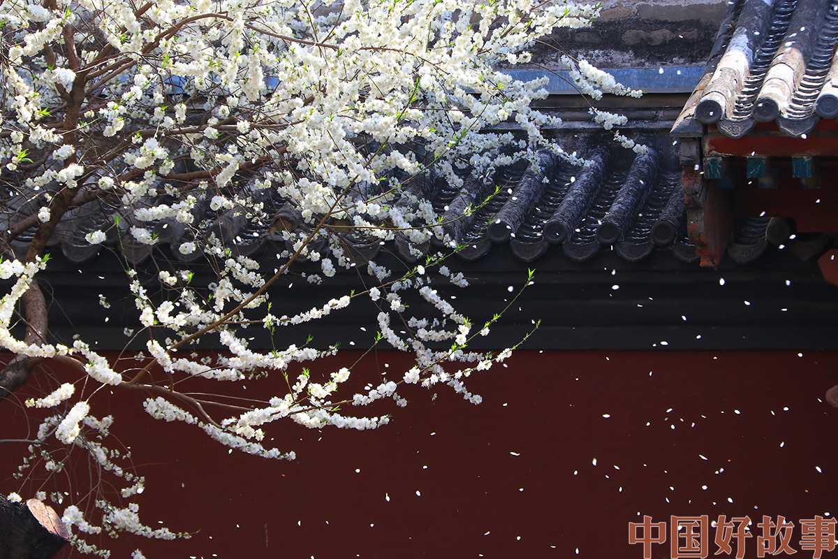 图为雍和宫墙外碧桃盛开,微风吹来,洁白的花瓣宛如雪花落下。宋家儒摄