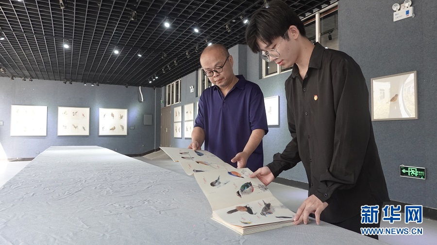 王东云和他的导师何广庆就“百鸟图”作品进行交流。新华网发