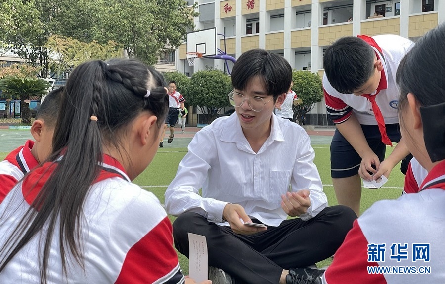 王东云走进校园为孩子们介绍珍稀鸟类。新华网发