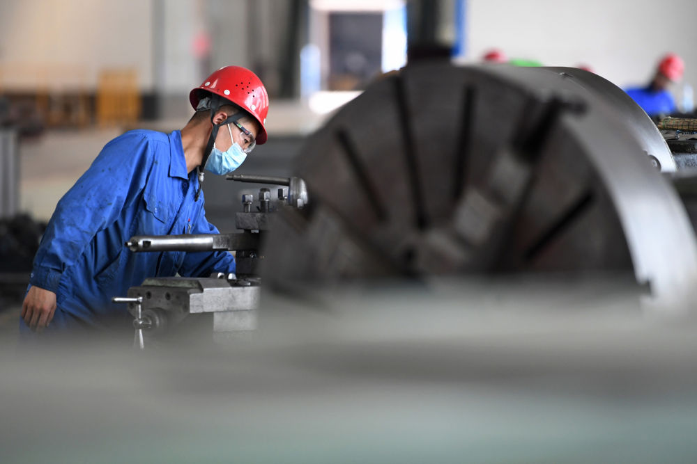 工人在兰州新区兰石集团高端装备产业园车间内作业(2022年8月11日摄)。新华社记者 陈斌 摄