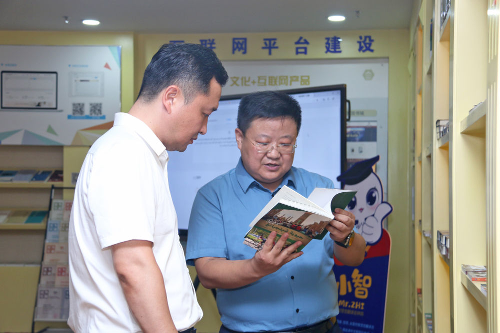 张时荣代表(右)在介绍团队翻译的阿文版图书。(受访者供图)