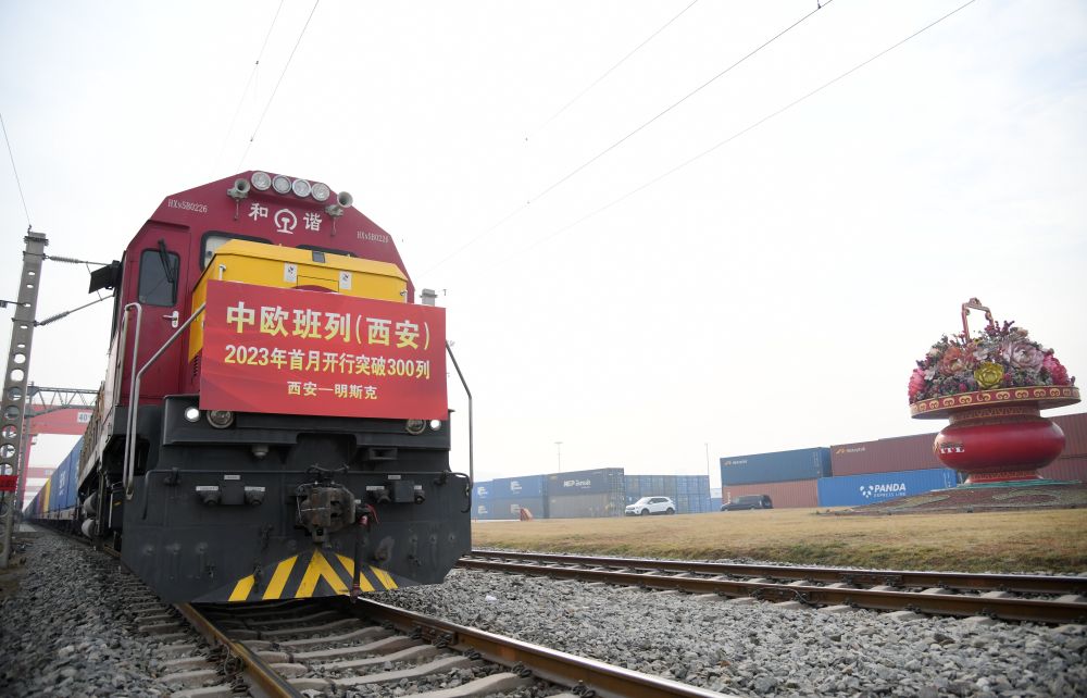 2月1日,X8151次中欧班列准备从西安国际港站开往明斯克。当日,满载日用百货的X8151次中欧班列从西安国际港站驶出,开往白俄罗斯首都明斯克。新华社记者李一博摄