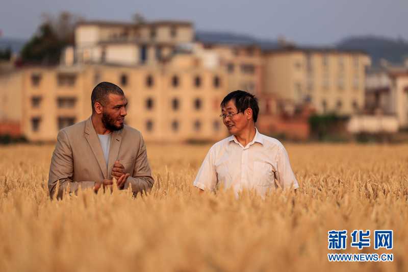 艾哈迈德·埃尔法纳和杨木军在小麦基地察看DH育成品种。新华网 赵普凡 摄