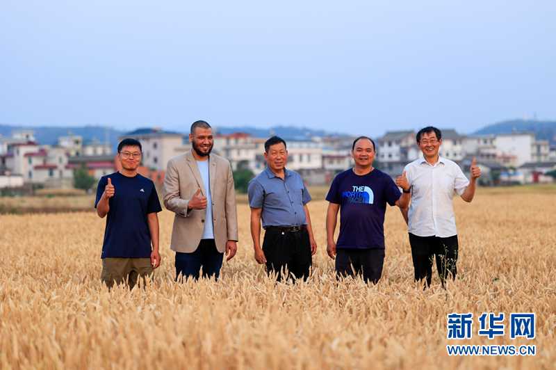 艾哈迈德·埃尔法纳(左二)和中国专家在麦田里合影。新华网 赵普凡 摄