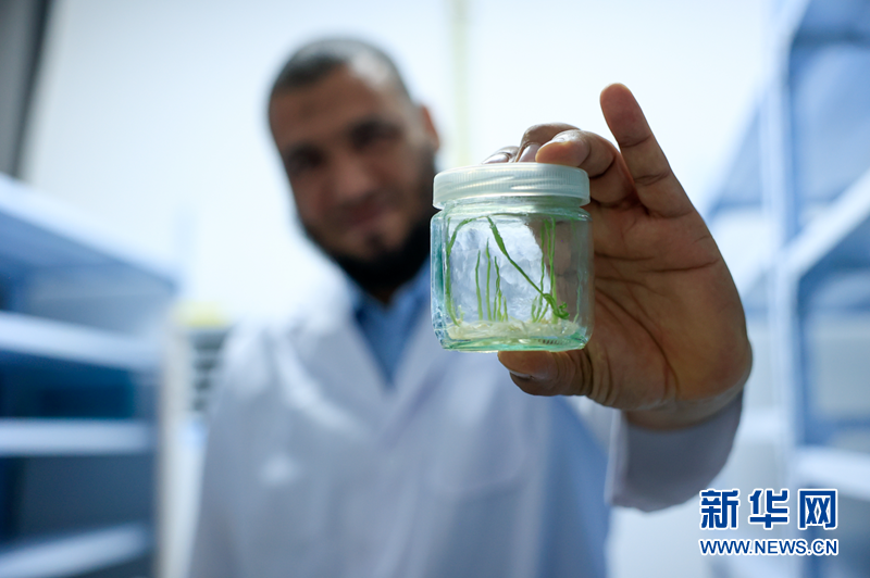 艾哈迈德·埃尔法纳展示云南省农业科学院粮食作物研究所小麦新技术研发创新团队培育的小麦单倍体苗。新华网 赵普凡 摄